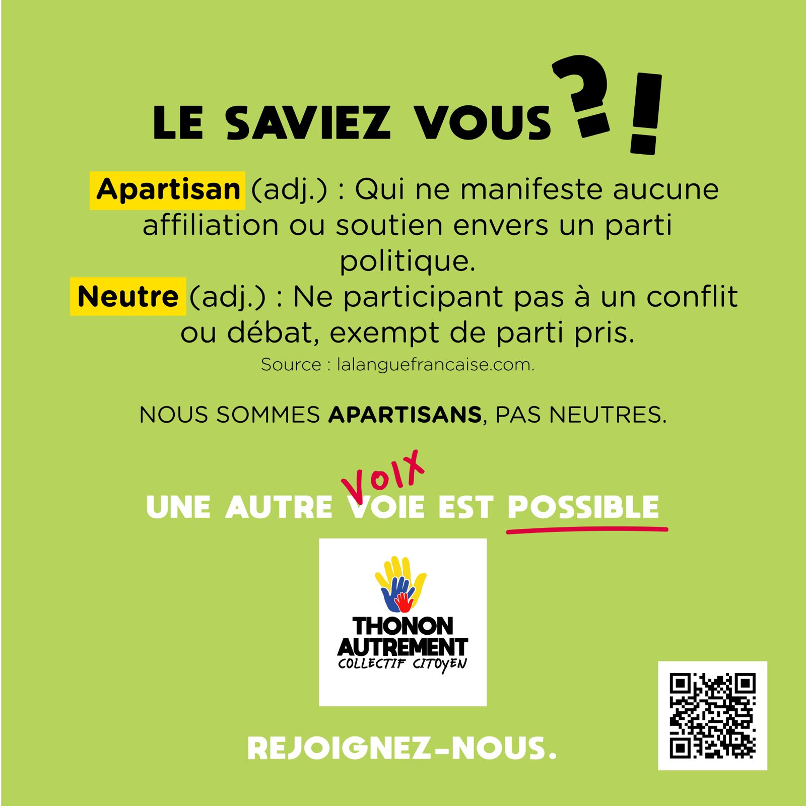 Par souci de transparence et de probité ainsi que par fidélité à nos valeurs et notre charte, nous ne donnons aucune consigne de vote pour le second tour, vos voix sont les vôtres : légitimes et libres de s’exprimer.